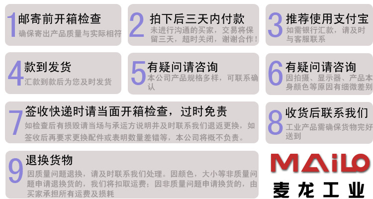 7.如果您在本公司买到的商品发现有质量问题,请及时电话联系我们或者咨询在线旺旺沟通,办理退换货事宜。但对因大小、颜色不适合等非质量原因申请退货的,我们将要扣取商品邮寄的运费,如因非质量问题申请换货,将由买家承担商品所有运费及损耗。