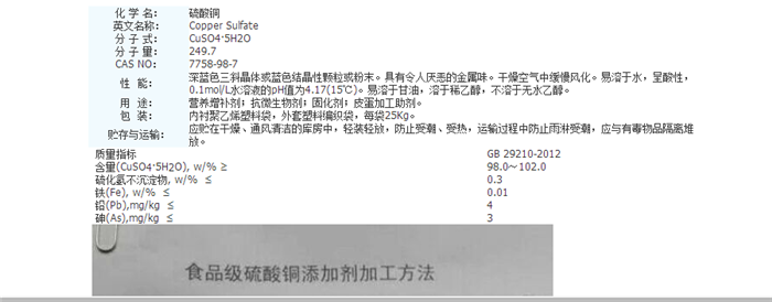 5、 食物添加剂硫酸铜有标准吗? 有国家标准。GB 29210-2012《食物安全国家标准 食物添加剂 硫酸铜》。与工业级硫酸铜不同,对硫酸铜纯度、铁、铅、*有严厉的约束要求。
