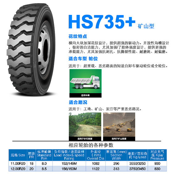 斑纹特色:超强的制动性与驱动功能,高耐磨,超强的地上附着功能,具有杰出的在中才能。适用路况:适用于恶劣路面和普通等级路面,中长途车辆运用。