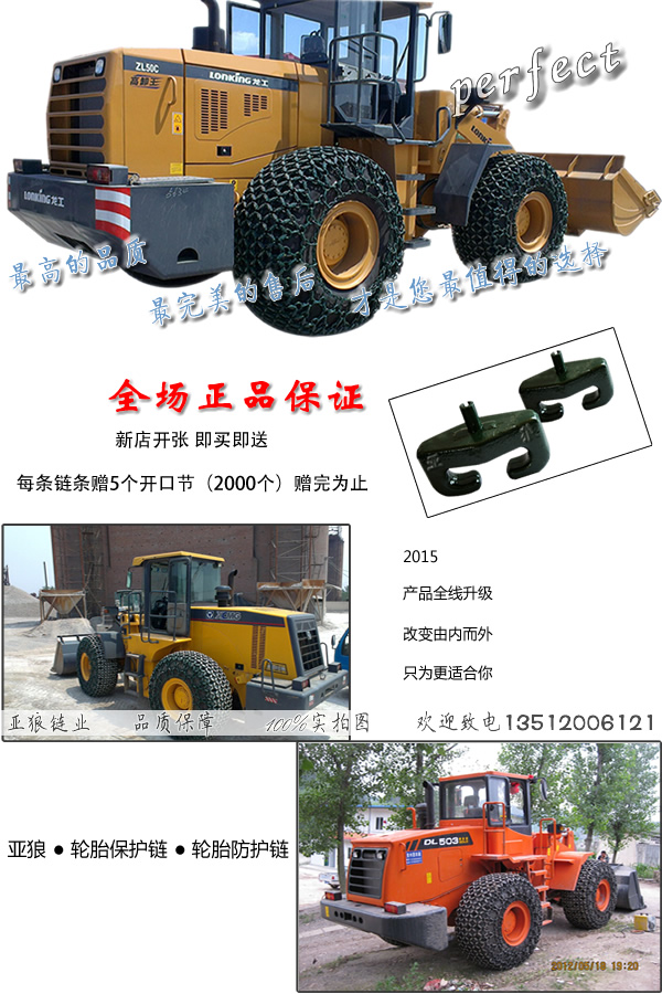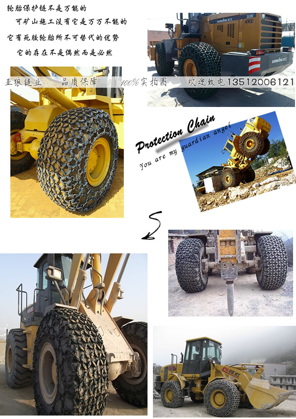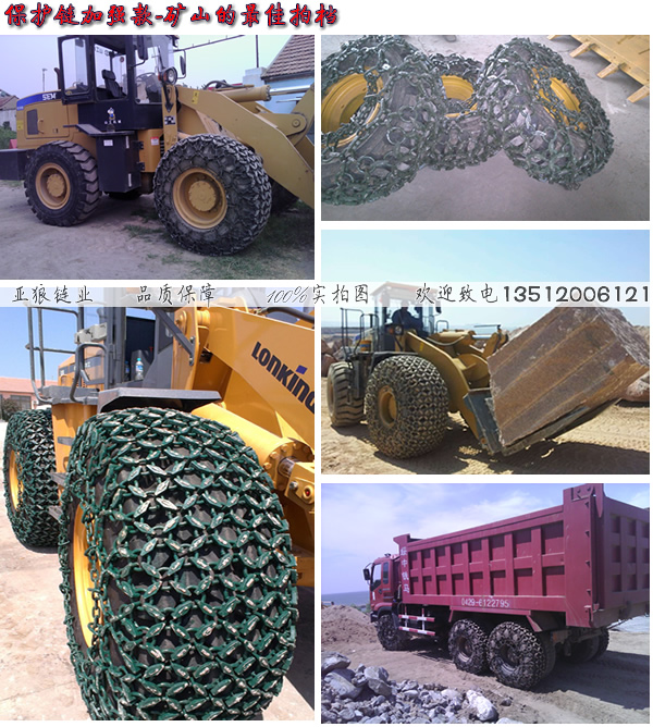 轮胎维护链是安装在 装载机上的,链条是选用合金钢制造的,咱们采纳接地主件和衔接侧节网式摆放,又以规格和类型的改变施工环境的不同断定孔距和节距的挑选。并依据轮胎的不同规格和作业特色的需求制造相应规格不同类型的产品。适用于矿山、采石场、地道等环境恶略的路面上。运用狼牌轮胎维护链可进步整机的牵引力和稳定性,削减轮胎打滑跳蹦,下降轮胎修补和运用本钱,延伸轮胎作业寿数,有用进步整机作业功率和施工经济效益,为您处理了因替换轮胎构成的许多资金丢失问题。