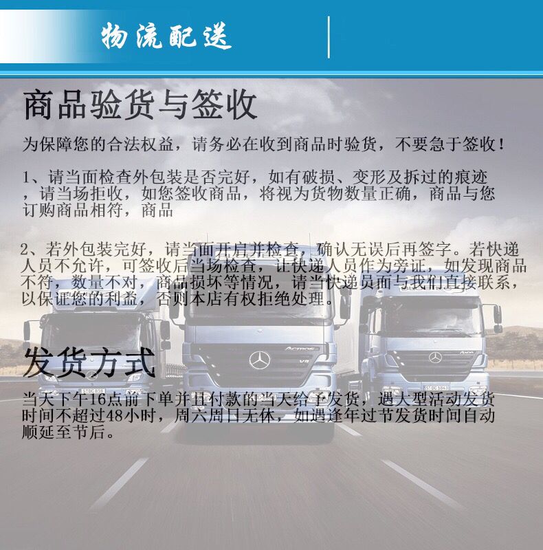 2、关于运送:收到货(快递当场验货,发现材料数量与订购单不符合,或材料严峻变形,损坏有问题请拒收),发现问题请及时联络咱们客服洽谈处理!