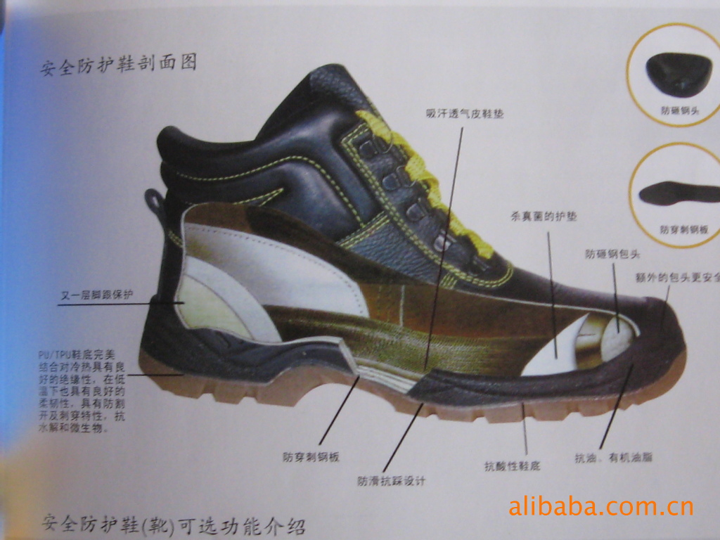 防护:A.选用欧标喷塑钢包头,具有防锈、防砸,维护足趾功用。B(可选,另加5元)选用欧标喷塑防刺穿钢底板,具有避免钢钉、五金废料等尖利物品穿透鞋底功用,完全维护足底。