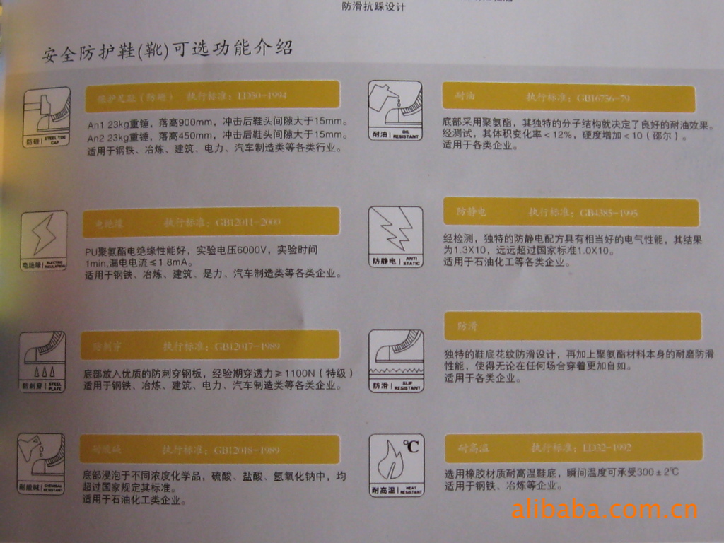 本厂以出产“龙海”牌和“昊霖之星"牌劳保防护鞋靴为主。产品配套完全,主要产品有:AN1维护足趾安全鞋、6KV绝缘安全鞋、防静电安全鞋、防刺穿I级安全鞋等、耐油酸碱防护鞋、耐高温防护鞋,产品均具有防滑、透气的功用,规划优异合理,制造精密考究,质量过硬,功用优越。