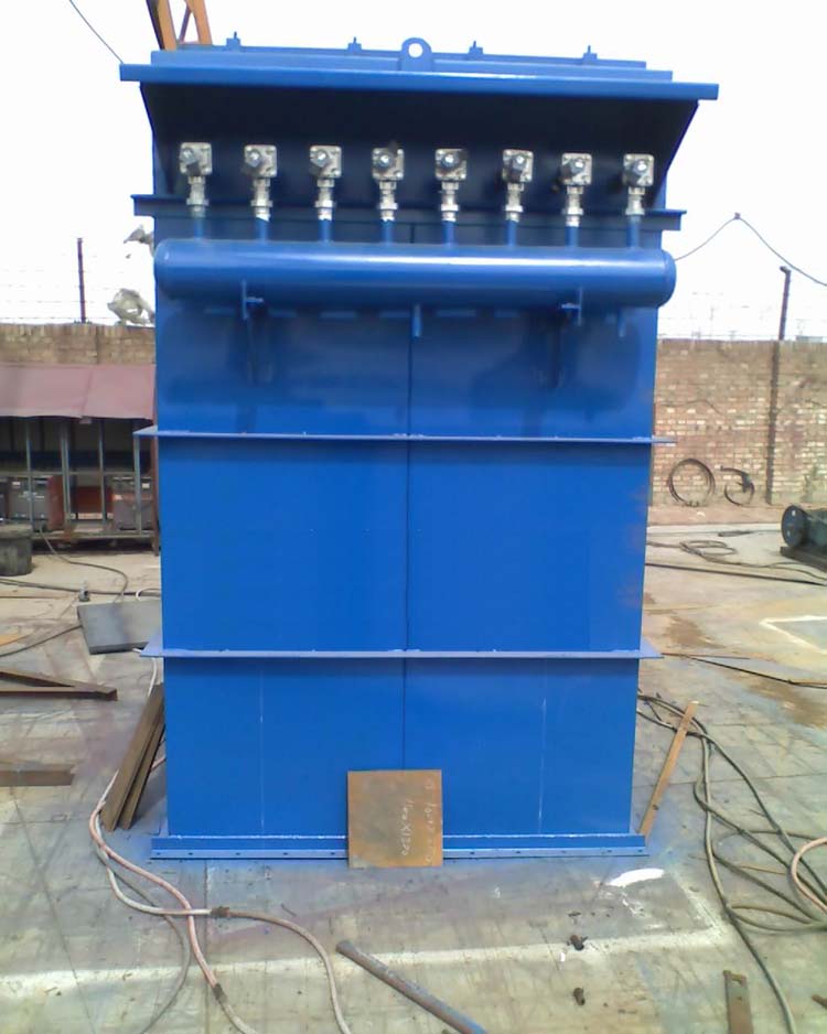 1、上箱体:包含除尘器盖,旋转揭盖设备、净气室、换袋入孔、调查孔、出气口。