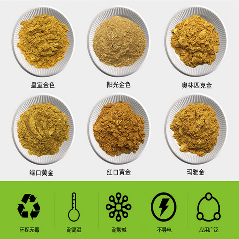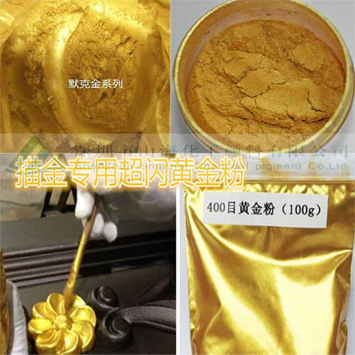 高亮闪的999黄金粉又称金箔粉,做出产品颜色纯粹,亮度高,适用于铁艺,工艺品,佛像,雕塑等工程。些作用并非普通珠光粉可比较。