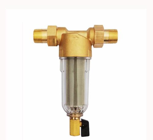 前置过滤器通常为“T”型结构。上面的“一横”的位置左右两端分别为进出水口。下面的“一竖”位置为机身和内部的筒形过滤网,下端则为排污口,靠一个阀门来控制开启和关闭。