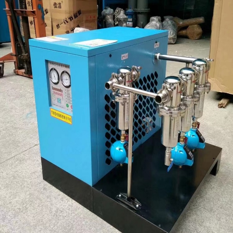冷冻式压缩空气干燥机通过冷却降温,使压缩空气中的水蒸汽凝结成液滴,从而达到减少含湿量的目的,凝结出的液滴经过自动排水系统排出干燥机。只要干燥机出口的下游管路所处的环境温度不低于蒸发器出口露点温度,就不会产生二次结露现象。
