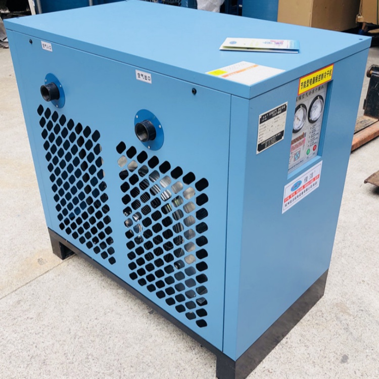 冷冻式干燥机是根据冷冻除湿原理,利y全f闭压缩式制冷系统,对经空压机排出的压缩气体冷却降温,使其中所含的大量饱和水蒸气、油雾凝结液滴,经过经气水分离后由自动排水器排出。较高温度的饱和压缩气体进入冷干机的预冷器,在预冷器中与来自蒸发器的干冷气体进行热交换,降低温度后进入制冷系统的蒸发器,与冷媒蒸汽进行d二次热交换,使本身温度降到接近于冷媒的蒸发温度,在两次降温过程中,压缩气体中的水蒸汽得以凝结成液态水滴并随气流进入气水分离器,分离下来的液态水经自动排水器排出机外,温度较低的干燥压缩气体进入预冷器,与刚进入的湿饱和气体进行热交换,使本身温度得到提高,从而在冷干机排气口得到含水量较低(即l点较低)、相对湿度也很低的干燥压缩气体。冷冻式干燥机由于工作可靠、管理方便、运行f用低l而成为各行业空压站房净化设备的s选机型。