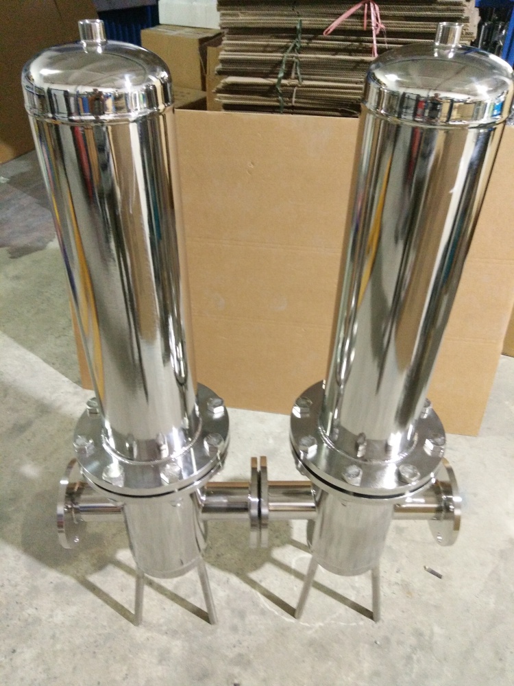 不锈钢过滤器,由壳体、多元滤芯、反冲洗机构、和差压控制器等部分组成后由不锈钢过滤器壳体内的横隔板将其内腔分为上、下两腔,上腔内配有多个过滤芯,这样充分l用了过滤空间,显着缩小了过滤器的体积,下腔内安装有反冲 洗吸盘。工作时,浊液经入口进入过滤器下腔,又经隔板孔进入滤芯的内腔。大于过滤芯缝隙的杂质被截留,净液穿过缝隙到达上腔, 从出口送出。