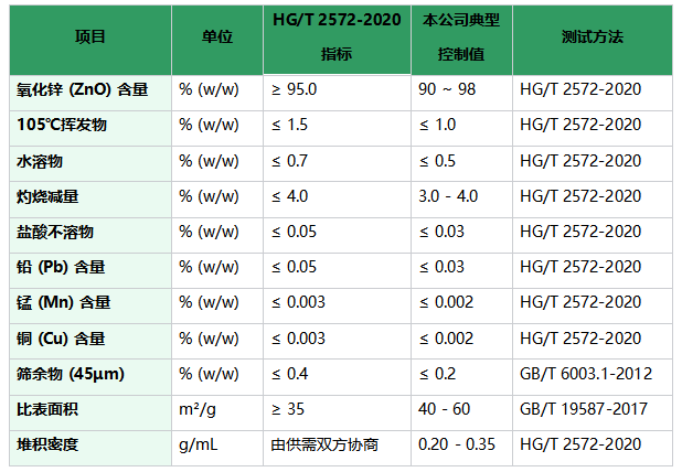 本品符合化工行业标准HG/T 2572-2020《活性氧化锌》的要求,其主要技术指标如下: