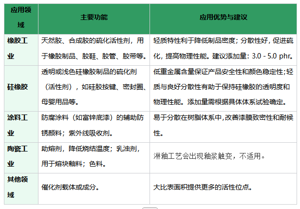 高反应活性: 较大的比表面积和微晶结构,使其在硫化反应中能更有效地与促进剂相互作用,提升反应效率。