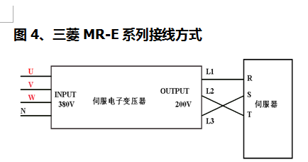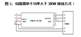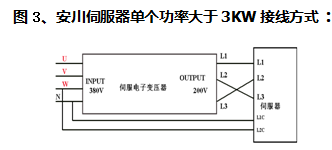 5. 封闭电源,接入伺服驱动器,电子变压器L1\L2\L3对应接入伺服驱动器L1\L2\L3,这点非常重要!必定不能接错,不然伺服器无法正常作业;(安川单个伺服器大于3KW是请按图3接线;三菱MR-E系列请按图4接线)
