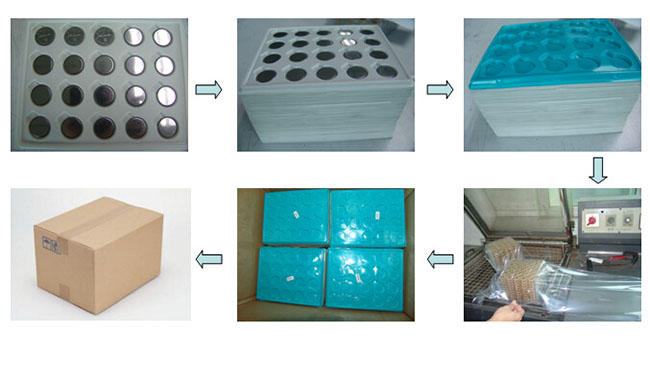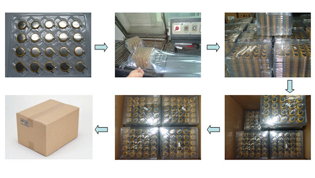 不同电池就有不同塑胶托盘装,如纽扣电池每个托盘装有20PCS、25PCS、50PCS、100PCS等电池凹槽固定,可以根据客户的要求定制空运/海运的标准包装;