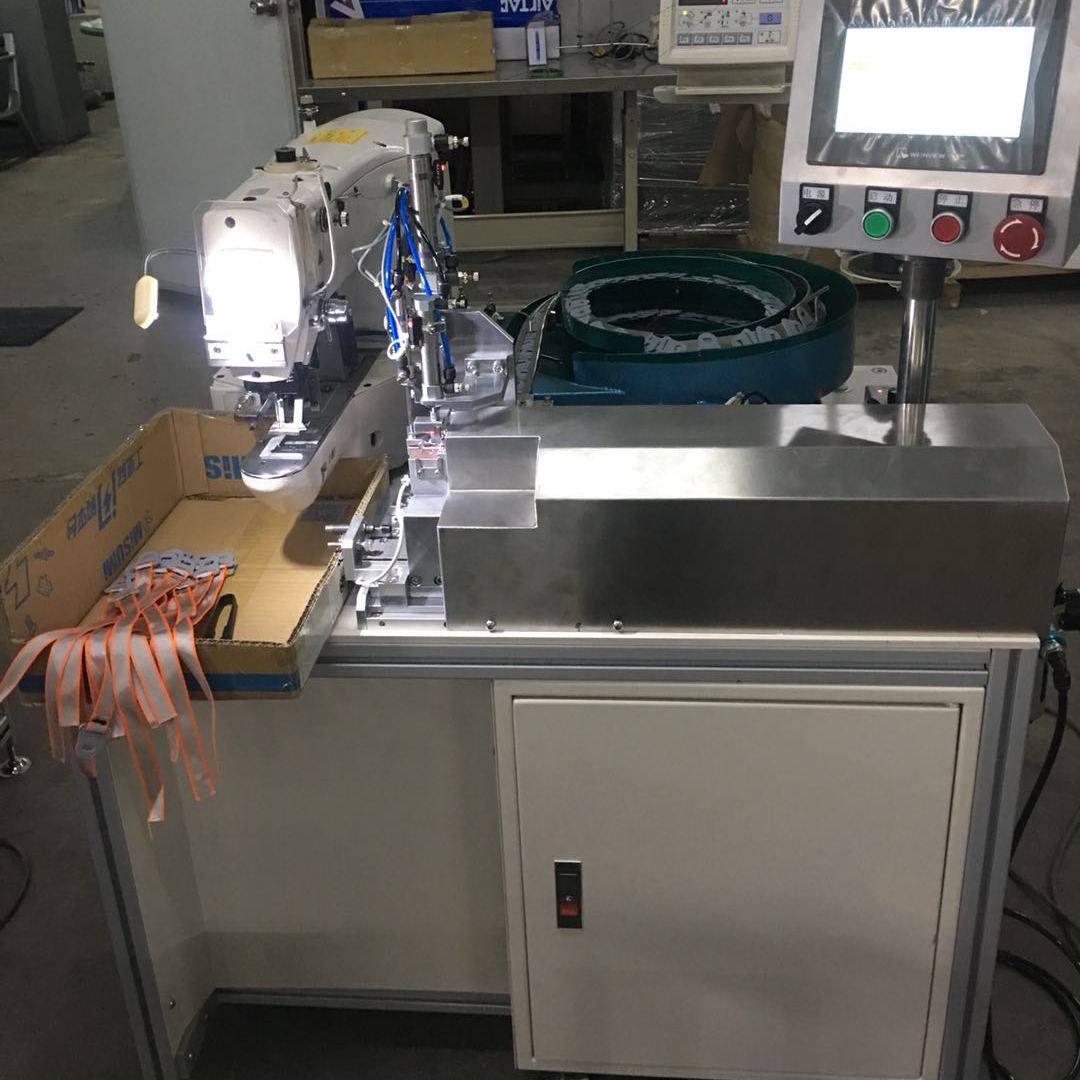 本产品用于安全帽绳穿扣,车缝服装包包饰品,安全帽绳带,宠物绳,矿业强光头灯穿扣,缝纫等工序。首要功能,扣主动上料,摆放,人手艺放肩带到光电方位切可,本机将主动啦带,穿扣,缝纫等动作。完结产品工序要求。