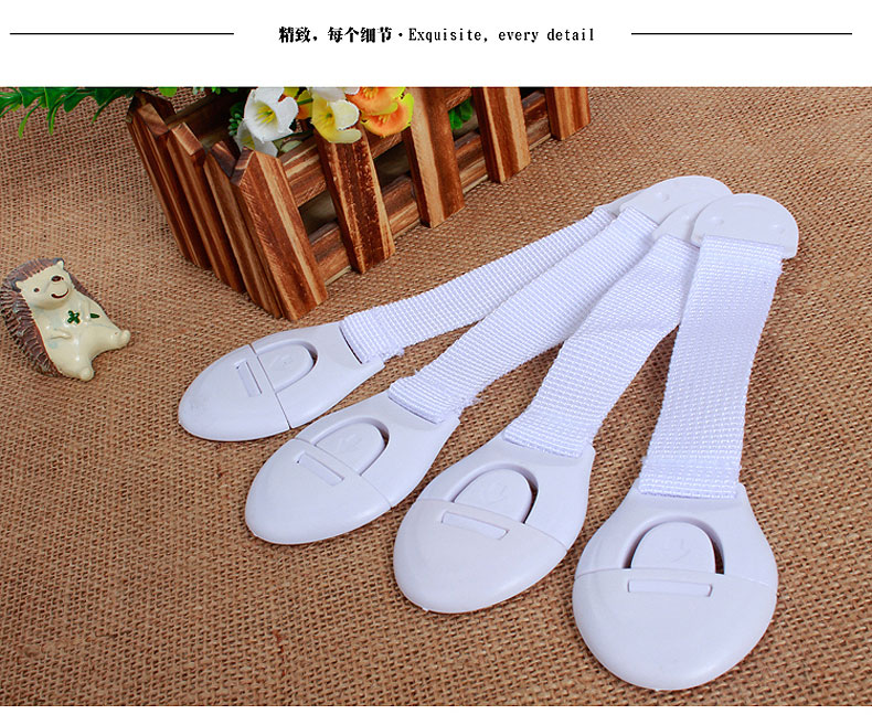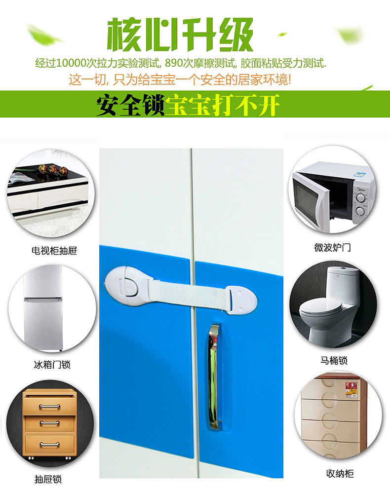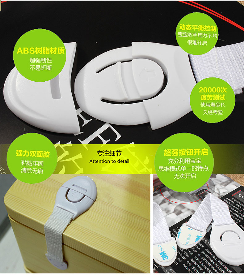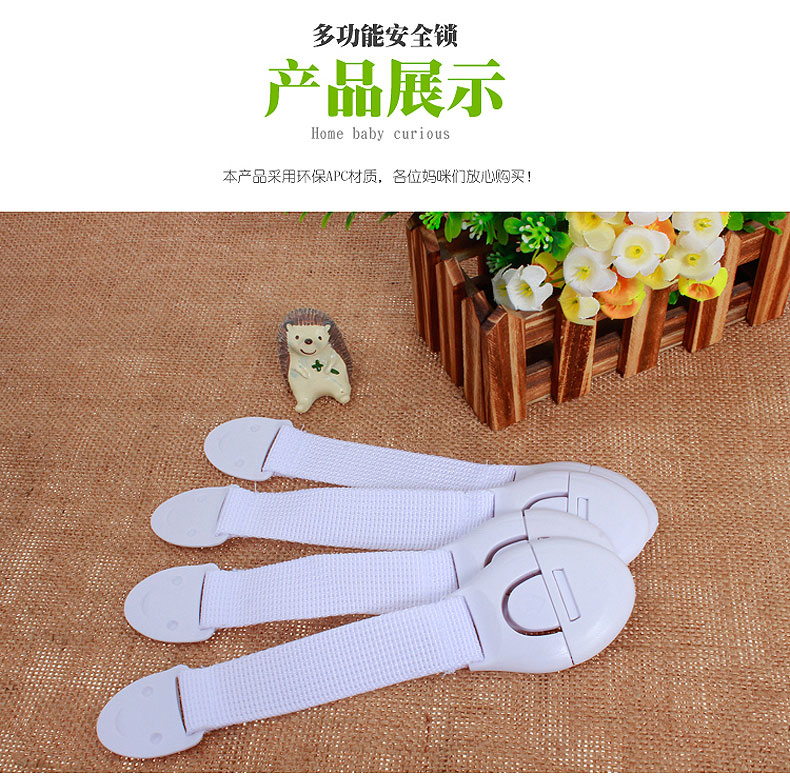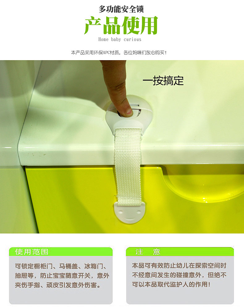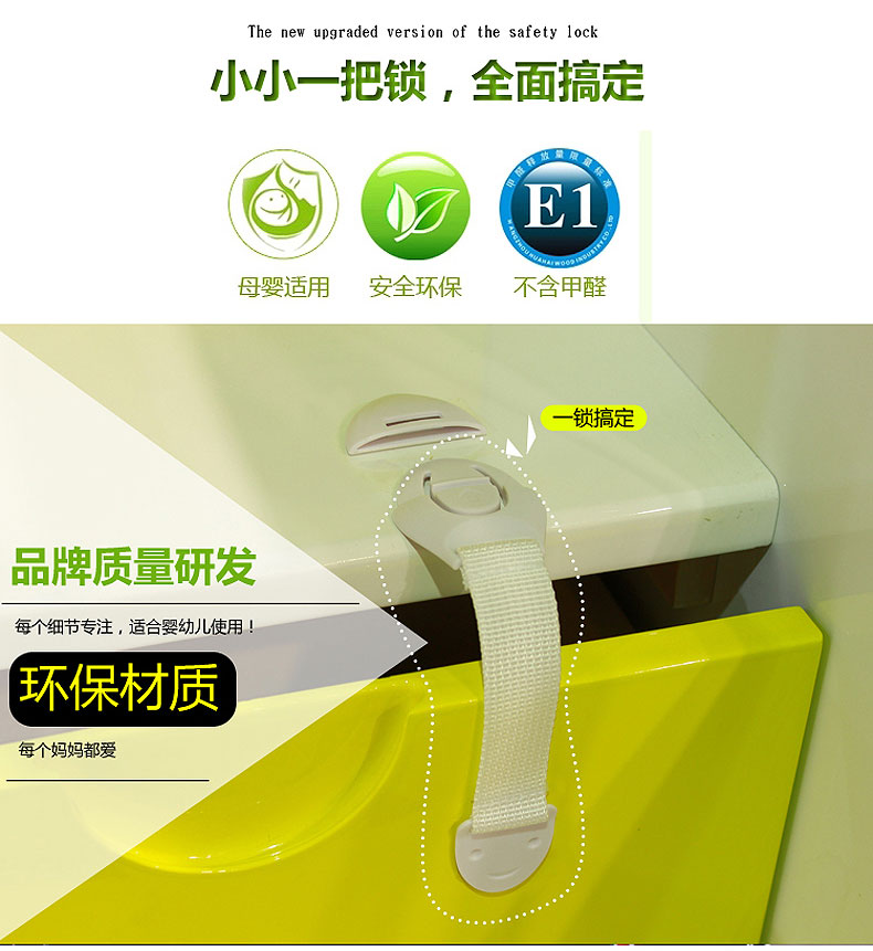 此产品可用于冰箱,橱柜门和抽屉,马桶等多用处锁.防止**翻开后,误食或搞乱里边的物品,以防止意外的发作.选用布带衔接使产品柔韧性更好,适用于任何角落的当地,并且在运用过程中不会刮伤家具.规划活泼可爱,不阻碍家具全体漂亮