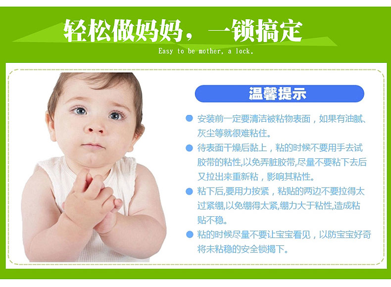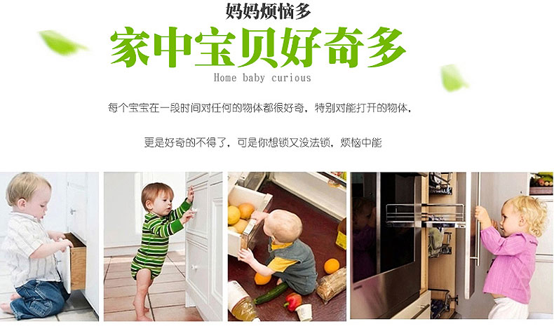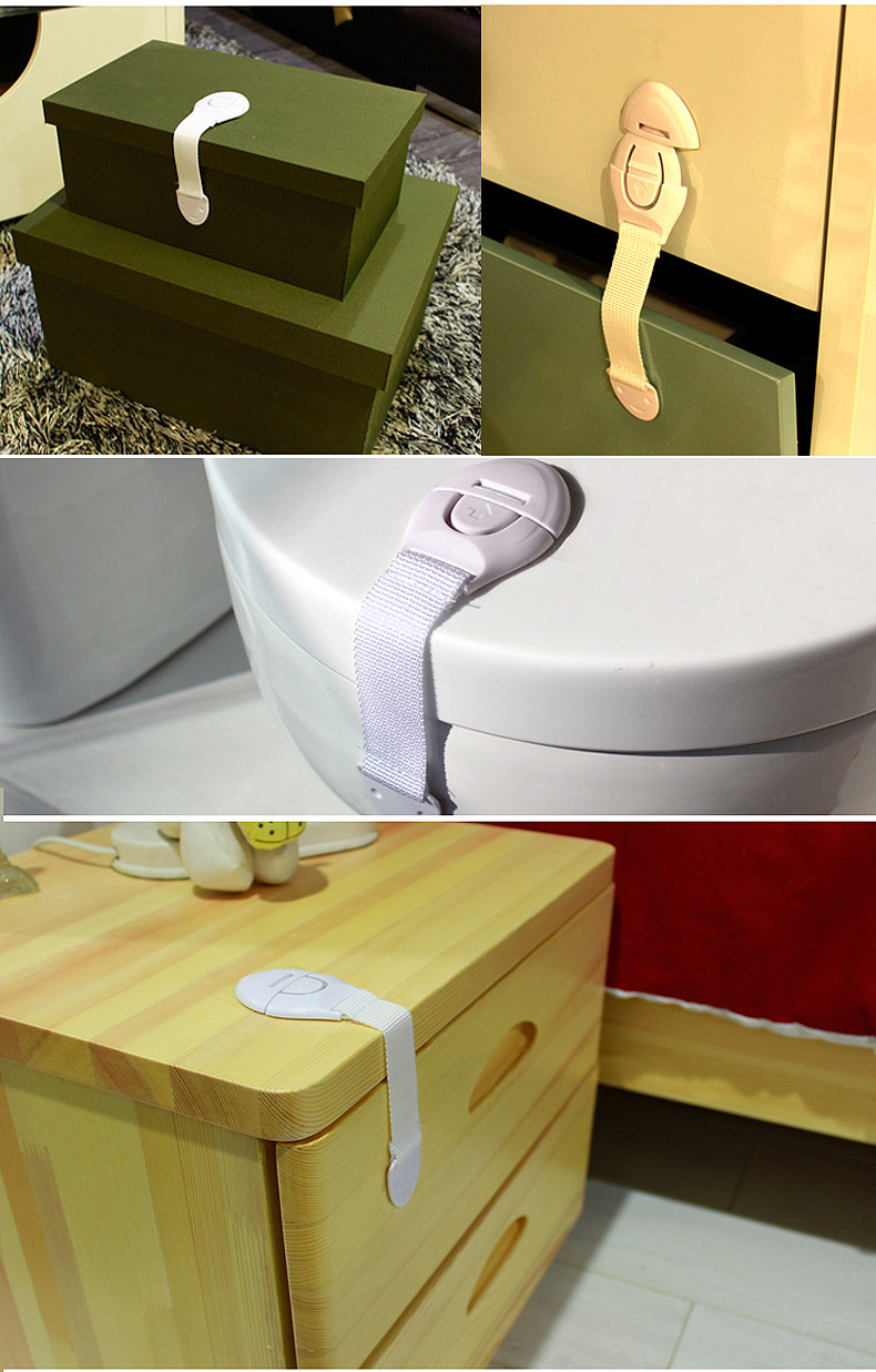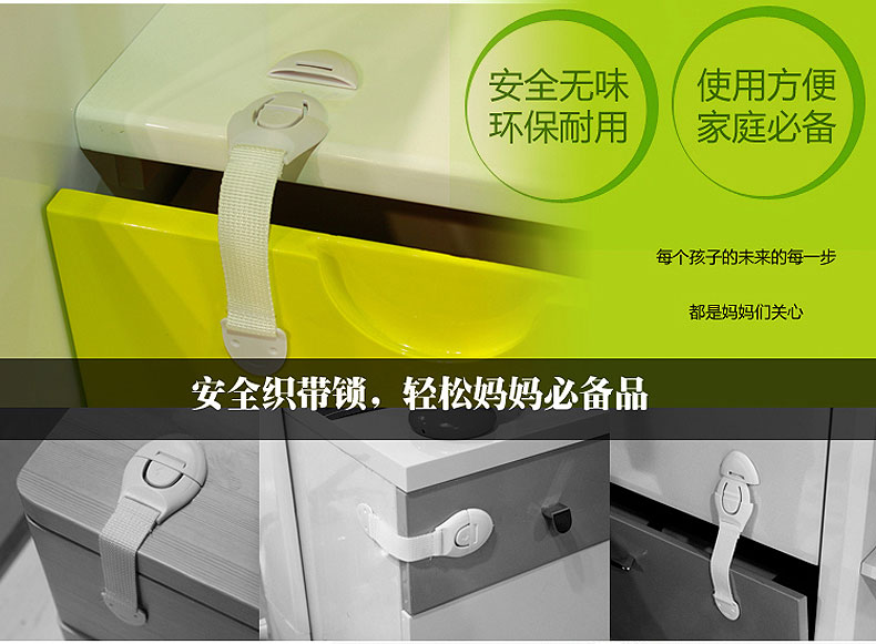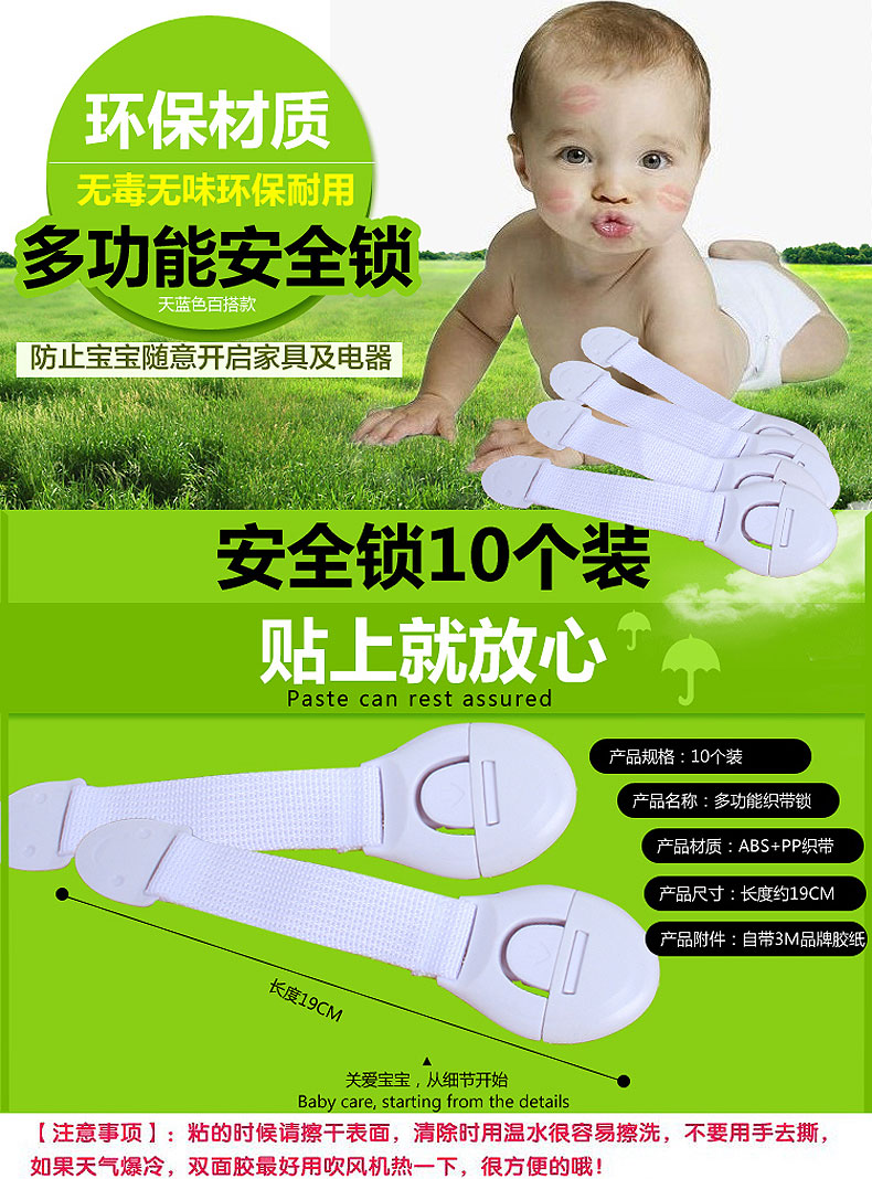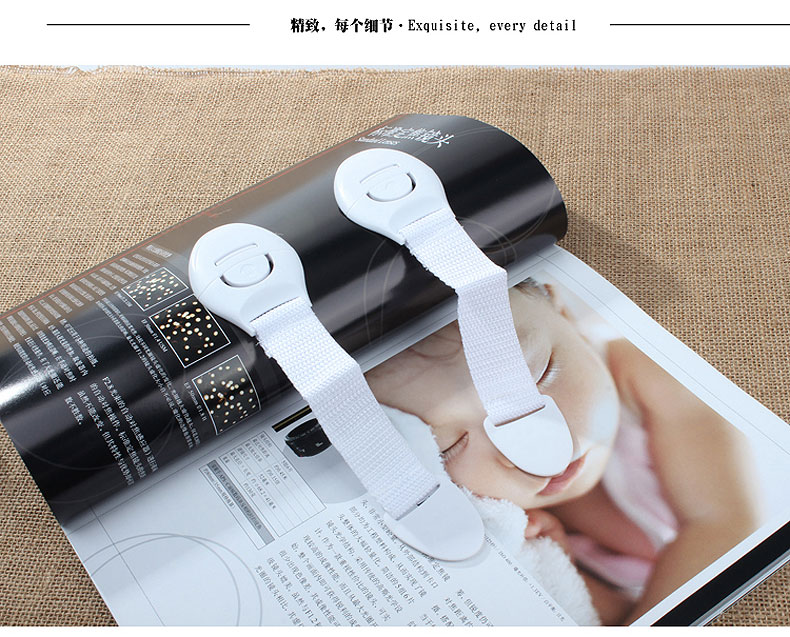 此产品可用于冰箱,橱柜门和抽屉,马桶等多用处锁.防止**翻开后,误食或搞乱里边的物品,以防止意外的发作.选用布带衔接使产品柔韧性更好,适用于任何角落的当地,并且在运用过程中不会刮伤家具.规划活泼可爱,不阻碍家具全体漂亮