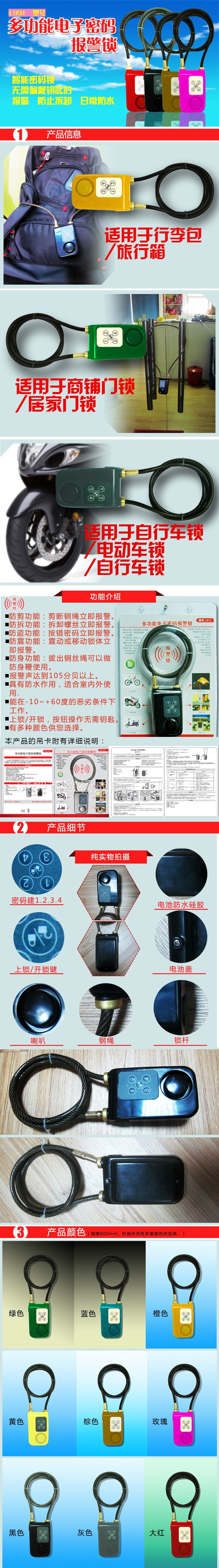 Y787电子暗码锁报警器适用于行李包、自行车、居家/商店门等物品的防盗维护,为您省去带着钥匙的不方便。当有人剪断挂绳、拆开锁体螺丝、屡次按错暗码或轰动、移动维护的物品时,都会当即响起报警声,起到维护物品、吓阻外侵者和提示主人的效果。
