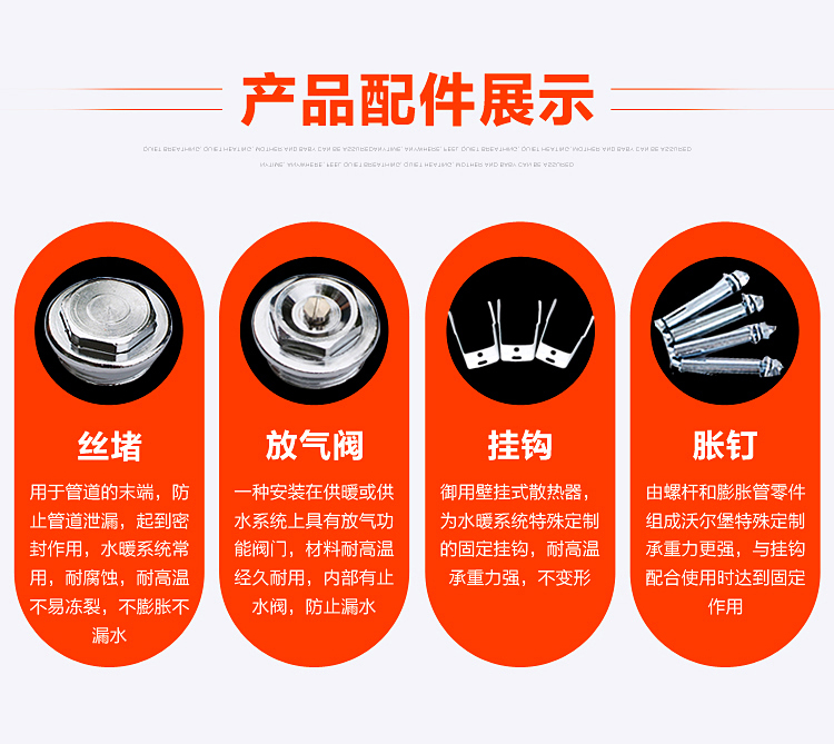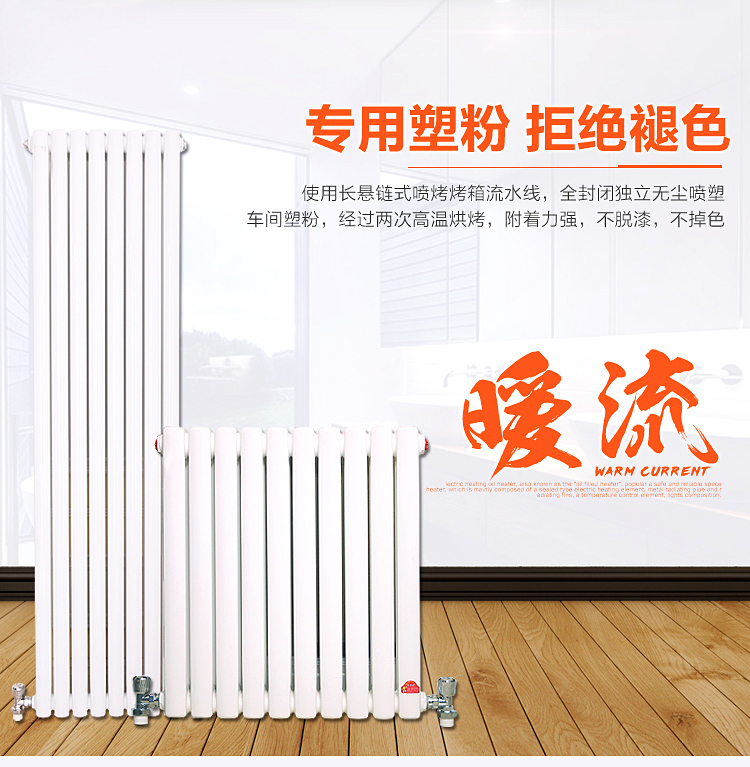 钢制柱型暖气片按单片中的管根数分二柱暖气片和三柱暖气片两种型式,表面用先进的静电喷塑和烘干等工艺处理,色彩艳丽,经久耐用,清洁便利。产品按多片联接成组出厂,进出水口为两边各两个,以便利各种方位装置,规格特殊要求需另定。